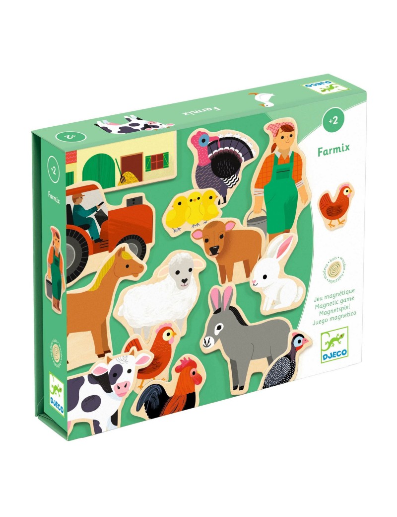 Un coffret de 24 pièces magnétiques en bois sur le thème de la ferme.