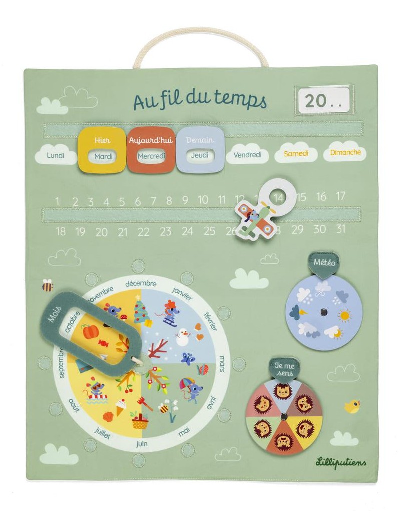 Le premier calendrier des enfants ! Chaque jour est l'occasion d'apprendre à se repérer dans le temps avec notre calendrier en tissu, pour les petits à partir de 3 ans. C'est le support idéal pour les aider à mieux comprendre la notion de temps qui passe et à identifier leurs émotions. Grâce à ses mollettes à tourner et ses éléments avec scratch, l'agenda permet d'indiquer : la date du jour ainsi que les notions d’hier et de demain, le mois et la saison à laquelle il correspond, l’année en cours, la météo et son humeur pour la journée. Pour apprendre en bonne compagnie, retrouvez Jules notre chien aviateur dans son avion, son ami Léon le hérisson, mais aussi des petites souris rigolotes et une foule d’illustrations toutes douces sur ce panneau d’activités en tissu. Avec ses jolies couleurs et son aspect ludique, ce calendrier se fond parfaitement dans la décoration de la chambre des enfants. Ce jeu éducatif Lilliputiens vous permet de mettre en place vos propres rituels avec votre enfant au quotidien : marquez la date du jour, choisissez ensemble la tenue la mieux adaptée au temps qu'il fait aujourd'hui ... Pratique et léger, il peut facilement se suspendre au mur à l'aide de la cordelette : idéal près de la fenêtre pour observer la météo, par exemple. Dans son format 39,5 x 46 cm, cet agenda en tissu est un support ludique pour apprendre comment fonctionne le monde qui nous entoure et transformer le quotidien de votre petit curieux en une vraie aventure ! Calendrier « Au fil du temps » composé de polyester et de coton, version française.