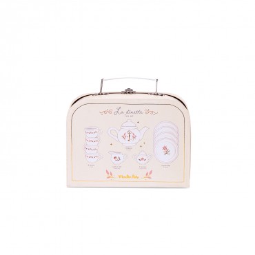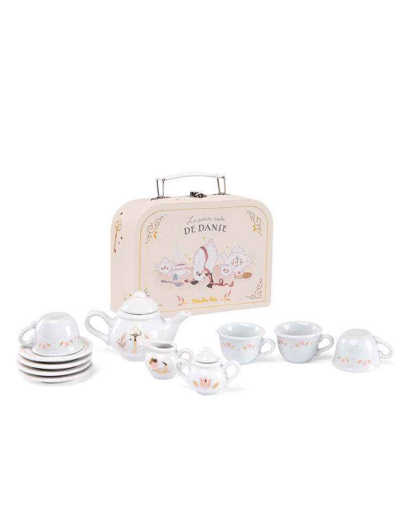 Service à thé en porcelaine orné de délicats motifs roses et dorés, présenté dans un ravissant coffret illustré pour servir le goûter à sa maman et ses amies les petites souris. Comprend 1 théière, 4 tasses et 4 assiettes, 1 pot à lait et 1 sucrier.