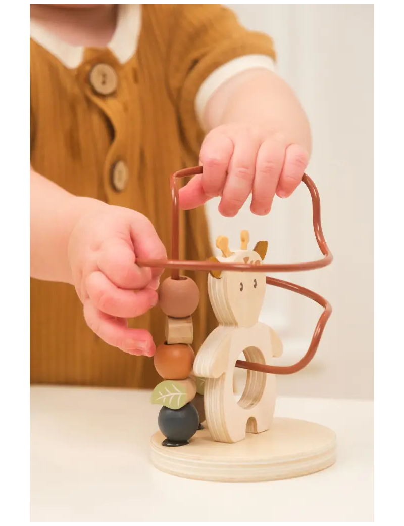 Grâce à son parcours métallique sinueux, l’enfant s’amuse à faire glisser les perles le long du circuit, en les faisant passer autour et à travers la girafe. Les différentes formes et couleurs encouragent la découverte sensorielle et la concentration.