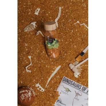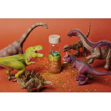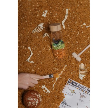 Cette bouteille sensorielle “cherche & trouve” plonge l’enfant dans un monde peuplé de dinosaures, fossiles et éléments naturels à observer attentivement.