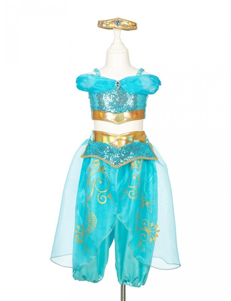 La princesse Amira adore danser. Vêtue de son magnifique ensemble bleu turquoise et de son bandeau assorti, elle nous montre ses talents de danseuse ! L'ensemble Amira est 100 % polyester et se décline en trois tailles : 3-4 ans (98-104 cm) : longueur du pantalon 48 cm, longueur du haut 25 cm ; 5-7 ans (110-122 cm) : longueur du pantalon 63 cm, longueur du haut 29 cm ; 8-10 ans (128-140 cm) : longueur du pantalon 76 cm, longueur du haut 33 cm. Le bandeau est ajustable grâce à une fermeture velcro.