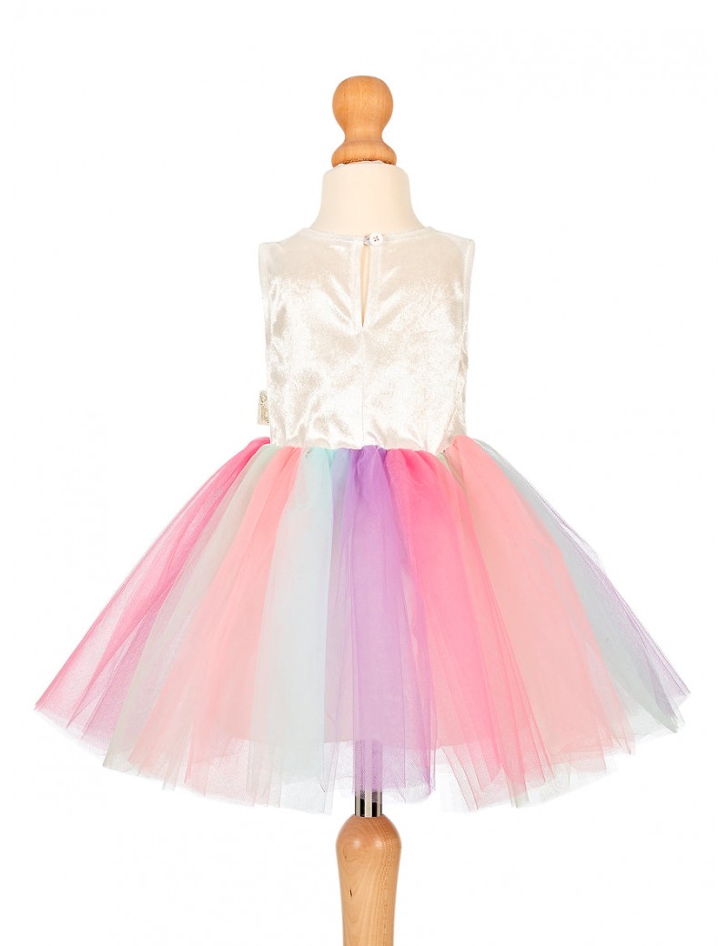 Pendant que cette licorne déguste son délicieux gâteau aux fraises, elle pense déjà à la prochaine saveur qu'elle choisira. Chocolat ? Red velvet ? Non, je veux de la vanille ! Ou alors, je reprends de la fraise ! C'est sa préférée. Elle pourrait en manger toute la journée ! La robe est 100 % polyester. La jupe mesure 30 cm de long (2 ans).