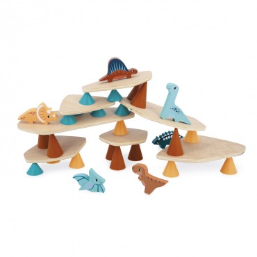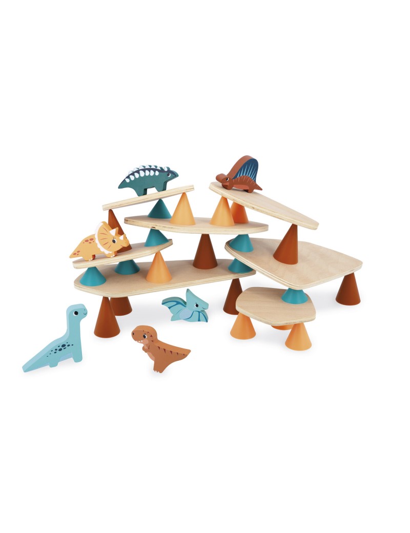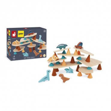 Piks, produit phare de la marque OPPI a été conçu avec des spécialistes de l'enfance pour répondre à des objectifs éducatifs précis : développer l'attention et la concentration, la motricité fine et les compétences visuo-spatiales. Grâce à la manipulation des cônes en silicone et des planches en bois, les enfants exercent leur coordination il-main, leur précision gestuelle et leur dextérité. En ajoutant ses dinosaures en bois, Janod apporte un univers singulier où les enfants composent, inventent, et développent leur imagination. Ce jouet est composé de 21 cônes en silicone de 3 tailles et couleurs différentes, de 6 chunkys dinosaures et de 7 planches en bois. Il encourage les enfants à anticiper les équilibres, à visualiser les formes et à organiser l'espace de manière logique. Jouet d'adresse pour les enfants à partir de 3 ans.