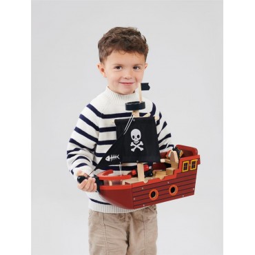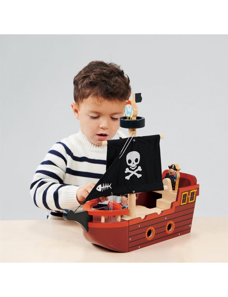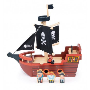 Un bateau pirate jouet avec 3 voiles en tissu imprimé, 4 sabords, une roue de bateau et 3 personnages illustrés. Un canon, une plate-forme d'observation en forme de nid d'oiseau et un drapeau sont également inclus.