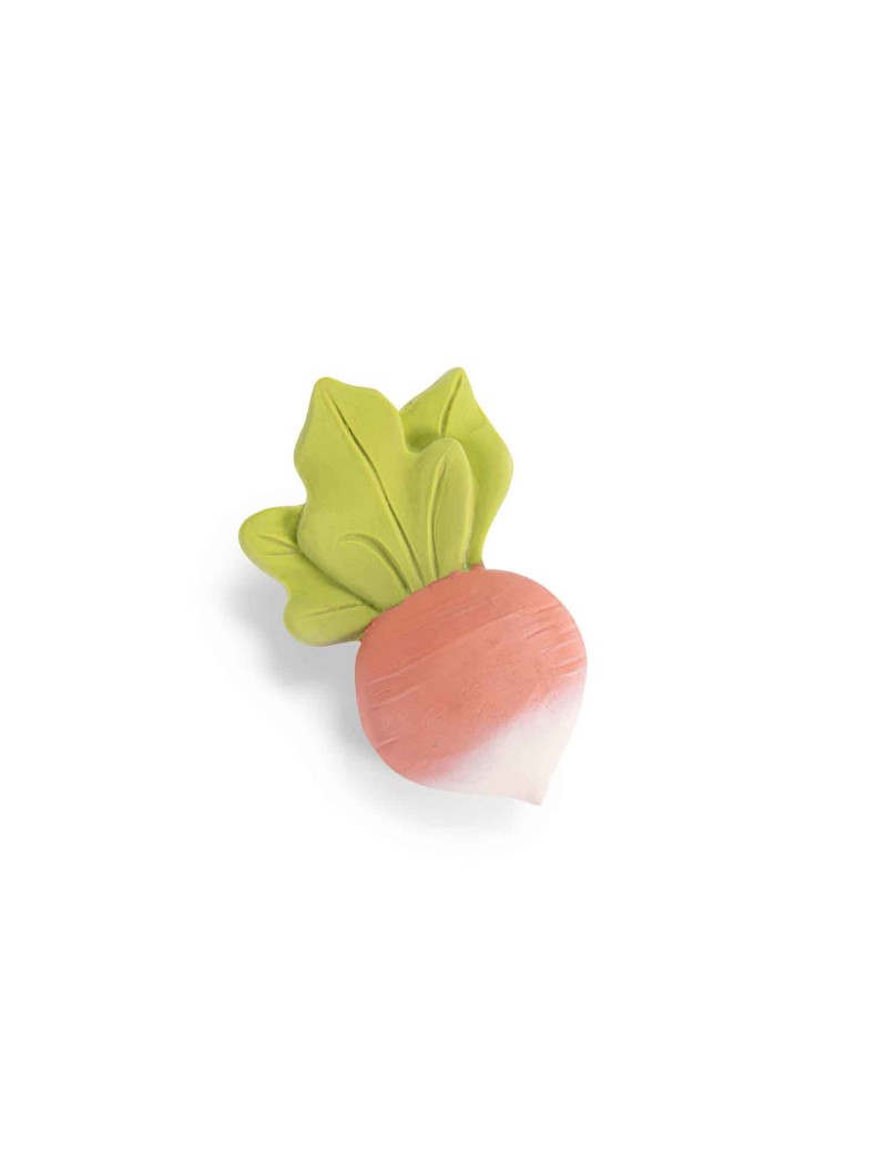 Hochet caoutchouc 100% naturel, issu de la sève d'Hévéa, en forme de croquant petit radis à mâchouiller et/ou à secouer. Facile à attraper par les petits mains, il éveillera les sens de bébé et apaisera ses gencives.