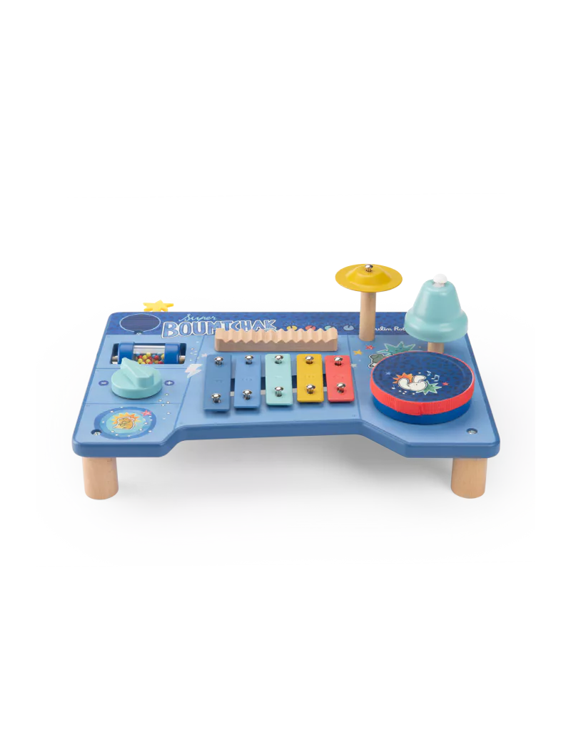 Le super boumtchak de Puce & Pilou est arrivé ! Taper sur le tambour, monter le volume, secouer les billes, faire tinter la cymbale…Une multitude d'activités à découvrir pour bébé. En bois et illustré, cette table musicale est facilement transportable.