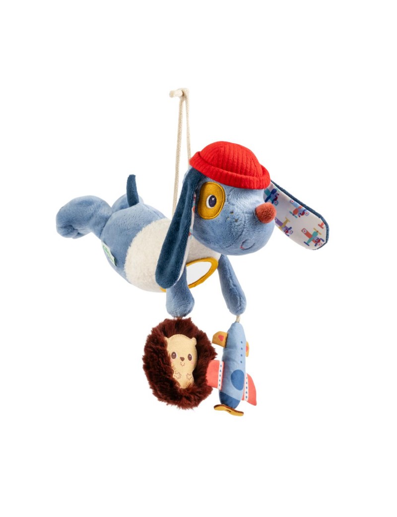 Jules veille sur bébé et le divertit ! Cette peluche chien à suspendre est idéale pour occuper votre tout-petit quand il est installé dans son cosy, en voiture, en poussette ... Vous pouvez même suspendre Jules à l'arche d'éveil, pour de chouettes moments de jeu ! Adapté dès l'âge de 3 mois, ce jouet nomade possède vraiment de quoi intriguer bébé. Il pourra se reconnaître et s'observer grâce au miroir rond présent sur le ventre de Jules, et s'amuser à saisir les petits jouets d'éveil qu'il lui tend amicalement : son petit avion contient du papier bruissant, à faire crépiter encore et encore ; et le joli hérisson propose un hochet à billes aussi amusant à agiter qu'à observer, avec ses belles couleurs ! Soit trois activités à disposition, pour un jouet à suspendre complet et super amusant ! Grâce à cet adorable chien en peluche, bébé joue avec les sons, les textures, les reflets ... Il éveille ses sens en bonne compagnie, celle de notre petit chien aviateur. Aussi facile à suspendre qu'à détacher, grâce à sa cordelette, ce jouet d'activité peut aussi bien s'utiliser simplement comme un chien en peluche à câliner. C'est un incontournable pour vos sorties avec bébé : grâce aux mouvements de la poussette ou de la voiture, la peluche bleue s'agite d'avant en arrière et s'anime pour toujours susciter l'intérêt de votre enfant. Jules est un petit chien qui adore aider ses amis : il porte un gilet à la texture duveteuse, agréable à toucher mais aussi très pratique quand il pilote son avion très haut dans les airs. Les motifs avions imprimés à l'intérieur de ses oreilles rappellent sa passion pour l’aviation. Et son petit bonnet rouge ! Trop craquant ! Dans son format 22 x 24 cm, vous pouvez offrir ce jouet premier âge comme cadeau de naissance, toujours partant pour une balade en plein air. Emportez Jules de Lilliputiens partout avec vous !