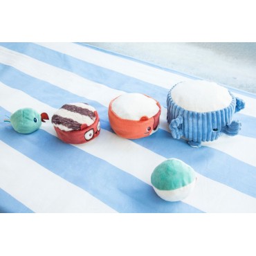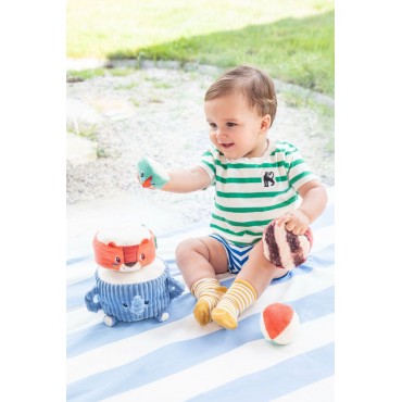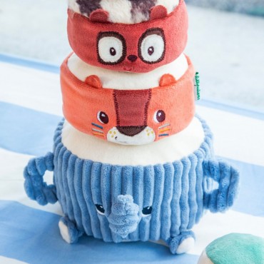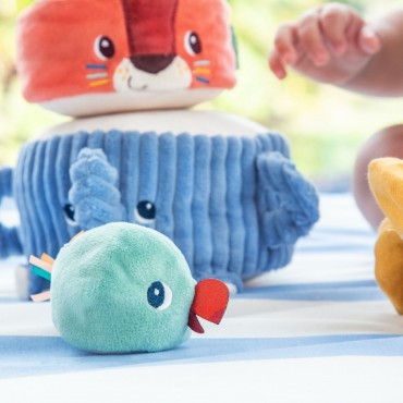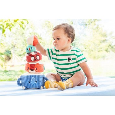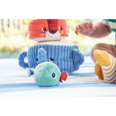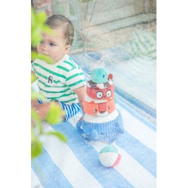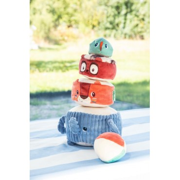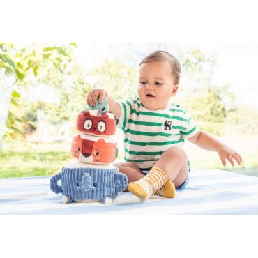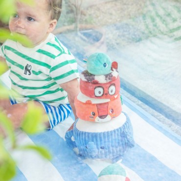 Albert léléphant porte fièrement ses amis de la jungle : Jack le lion, Elvis le lémurien et une perruche perchée tout en haut. Bébé les empile un à un pour construire une drôle de pyramide en tissu, et découvre à chaque étape un son différent à écouter et à manipuler. Quand la pyramide est dressée, place au défi rigolo : lancer la balle en tissu pour la faire vaciller et sécrouler dans un éclat de rires !