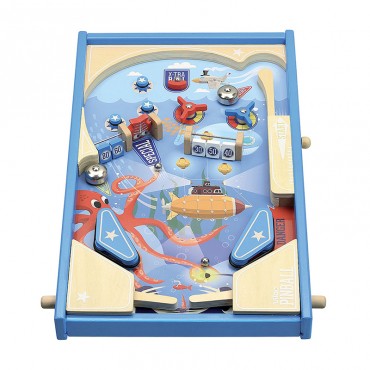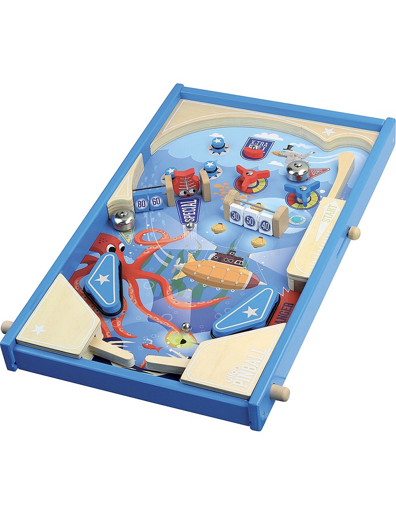Comme les grands ! Ce flipper en bois à poser est livré avec 3 billes en métal pour dégommer les cibles, actionner les clochettes, emporter les tourniquets… Marquez le plus de points et remportez la bataille sous la mer. Pieds en bois amovibles. A partir de 5 ans.