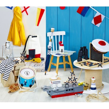 Vilac et la Marine nationale ont imaginé cette bataille navale en bois pour les petits stratèges de 6 ans et plus. Ce jeu de société, grand classique des ludothèques, se joue à deux. Chacun doit d’abord disposer sa flotte, composée de 5 bâtiments, sur son plateau. Ensuite, à tour de rôle, les joueurs tentent de couler celle de leur adversaire. Des craies leur permettent de suivre leurs actions sur le tableau vertical qui leur fait face. Lorsqu’un bâtiment est touché, des petits jetons permettent au joueur concerné de matérialiser ses avaries. Le gagnant est celui qui parvient à couler la flotte de l’autre en premier.