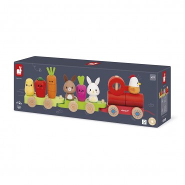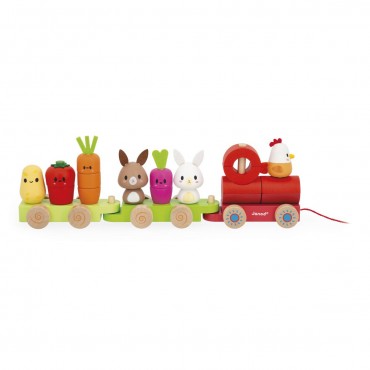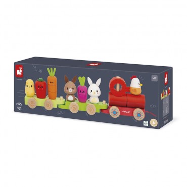 Tchou ! Tchou ! Laissez passer le petit train de la ferme avec ses légumes et ses petits animaux ! Joli train en bois de 3 wagons avec 19 pièces à assembler pour reconstituer les légumes du potager (pomme de terre, tomate, carotte et radis) et les animaux de la ferme (lapins et poule). Cette activité développera la motricité fine des plus petits quand les plus grand développeront leur motricité globale en allant se promener avec le train entier, grâce à la ficelle. Jouet d'éveil en bois FSCTM. Jouet à tirer pour les enfants à partir de 12 mois.