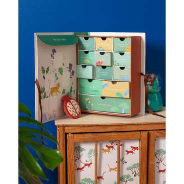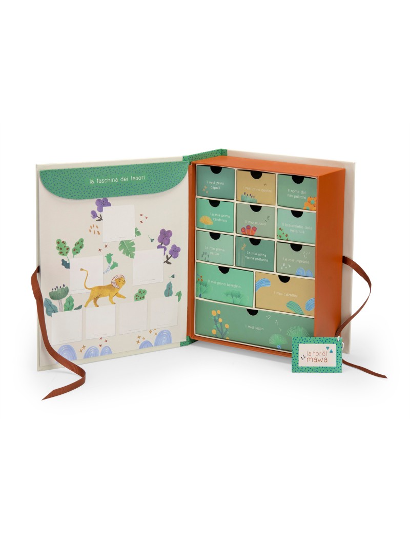 Coffret à trésors rigide pour conserver précieusement tous les trésors de l'enfance dans ses petits tiroirs. Se referme avec des liens et reprend les délicates illustrations des personnages de la forêt Mawa signées Élodie Coudray.