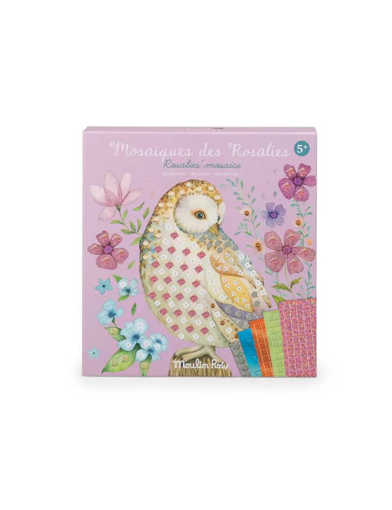 Grâce aux planches mosaïque adhésives, décorez le monde doux et poétique des Rosalies. Une activité ludique et créative à faire seul ou à plusieurs. Ce coffret comprend 5 cartes illustrées, 10 planches de mosaïque et 1 planche de strass.