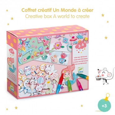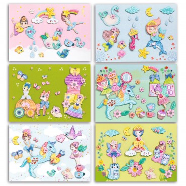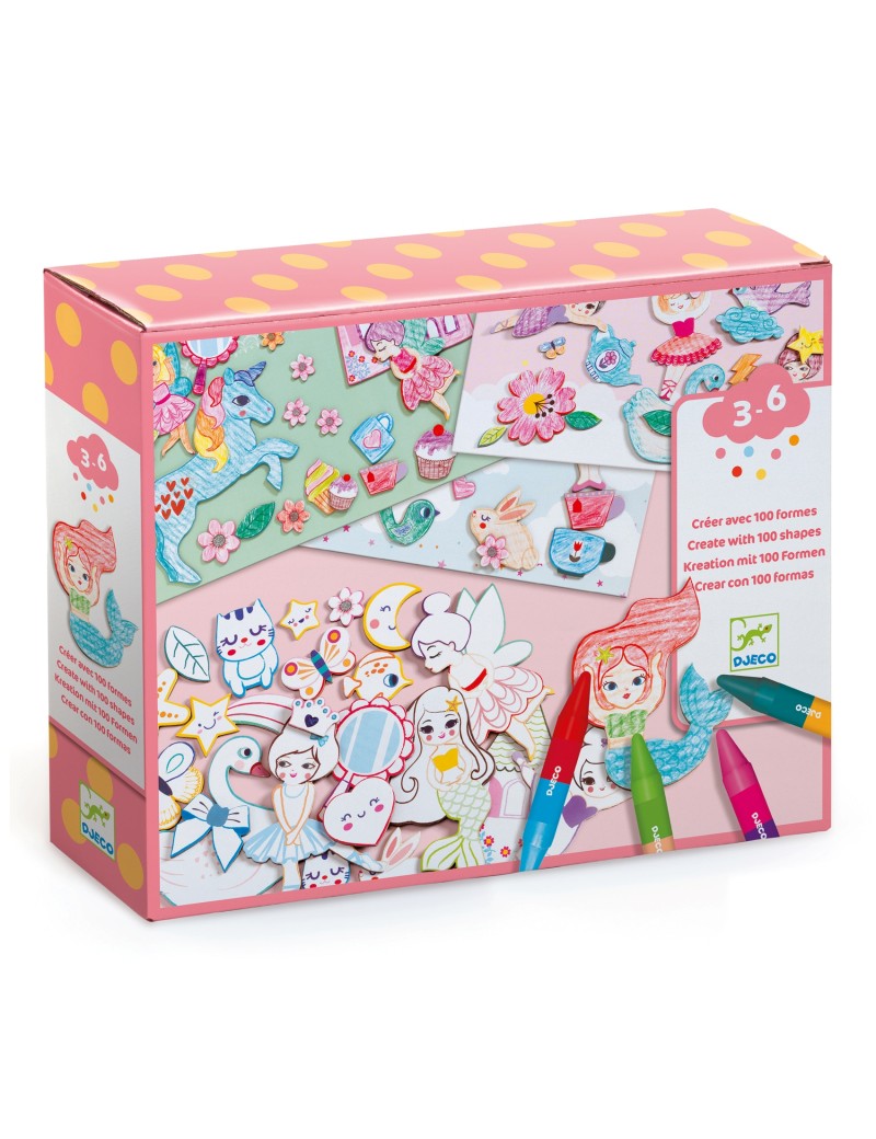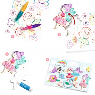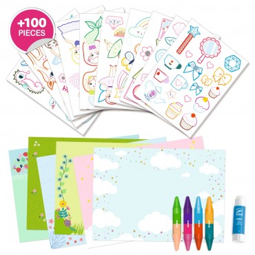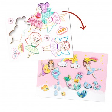 Un coffret créatif sur le thème rose. Une multitude de formes en carton épais à colorier et à coller sur les 6 grands décors. Le livret pas à pas propose à l'enfant quelques modèles.