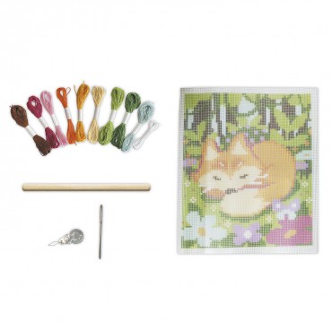 Contenu : 1 toile imprimée à broder entièrement (21x15 cm), 10 fils de couleurs différentes, 1 aiguille, 1 baguette en bois pour suspendre le canevas et 1 livret de 12 pages