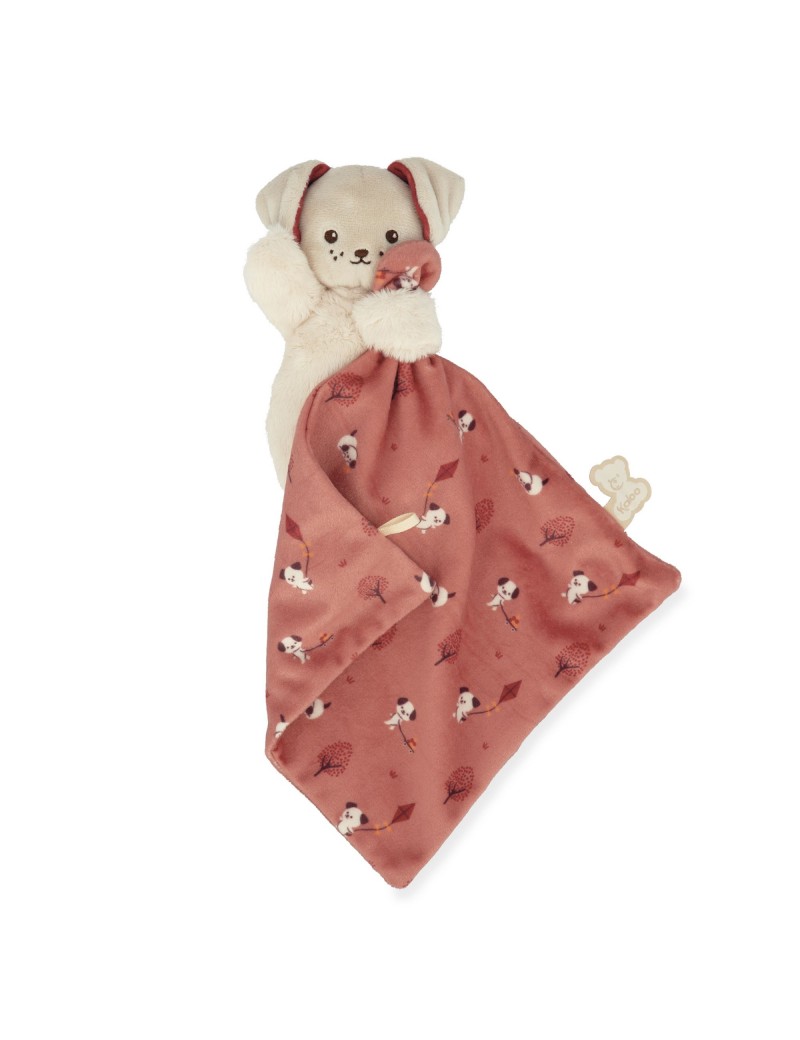Le doudou chien, complice des câlins ! Adapté à bébé dès la naissance, ce doudou couleur brique sera un compagnon tendre et rassurant pour votre enfant. Composé de 95% de matières et rembourrage recyclés (polyester), c'est un doudou aux tons roses, terracotta ou orangés ; aussi douillet que réconfortant. Le petit chien est doux comme une étreinte, il est facile à saisir par bébé et fait craquer toute la famille avec sa jolie petite frimousse. Cette peluche chien tient un beau carré douceur de couleur brique, avec un imprimé délicat et très spécial : il montre un petit chien qui joue dans le jardin, ainsi vous pouvez conter une petite histoire à bébé ou le voir observer les illustrations avec curiosité lorsqu'il grandira ! Le doudou carré sera très apprécié du tout-petit, qui pourra le câliner tout contre lui. Il permet aussi d'envelopper le petit chien telle une couverture chaleureuse et rassurante. Nous avons apporté le plus grand soin à la sélection des matières et aux détails des imprimés. Ainsi, les oreilles du petit chien sont assorties au doudou plat, ce qui réhausse le tout. Le chien en peluche mesure 14 cm, tandis que le doudou carré mesure 18 cm. Présenté dans son joli coffret personnalisable, le doudou en matière recyclée est un cadeau de naissance idéal ! Avec ses couleurs éclatantes, sa douceur intense, sa petite bouille et son imprimé poétique : ce doudou Kaloo est composé d'une petite peluche ainsi que d'un doudou classique, pour offrir à bébé son ami pour la vie ! Vous pouvez laver le tout en machine à 30°, sans assouplissant ou autre additif afin de préserver toute sa douceur.