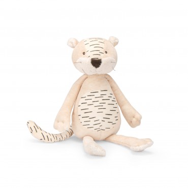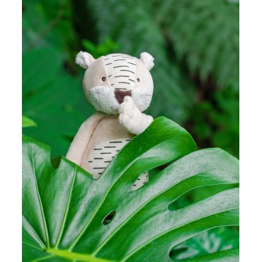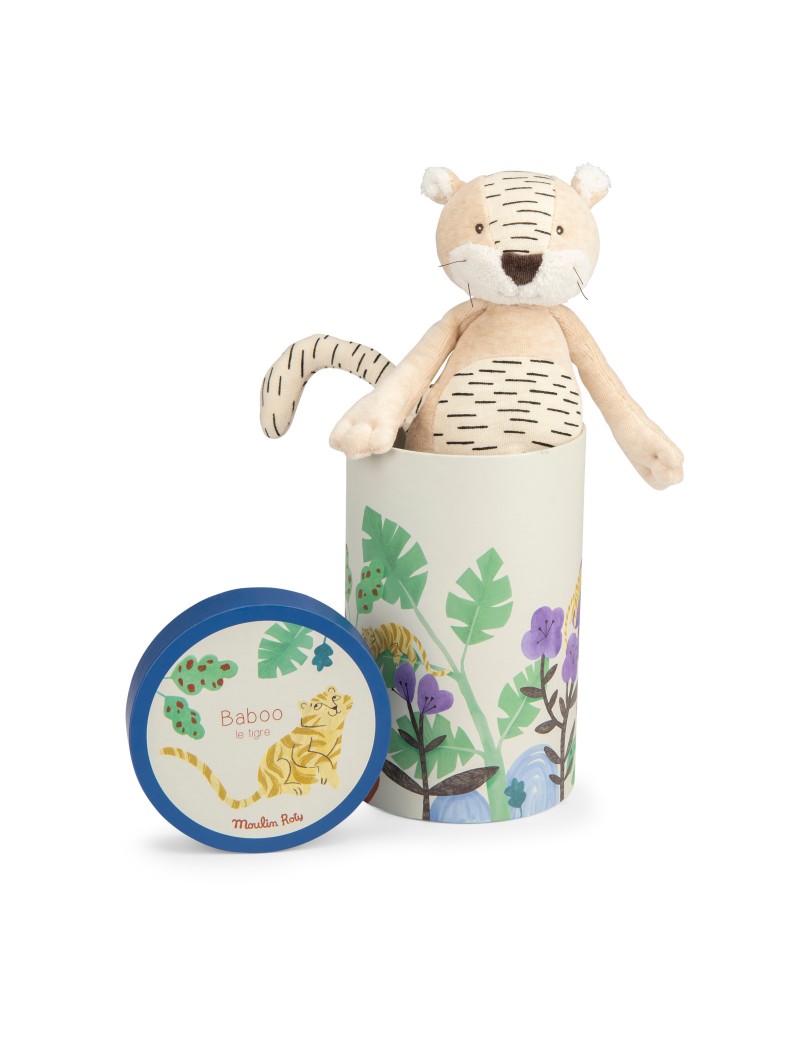 Baboo, le tigre un brin paresseux, est toujours prêt à se faire câliner. Tout en rondeur avec sa fourrure crème et ses rayures graphiques, il sera le partenaire idéal des enfants. Il loge dans une boîte joliment illustrée à l'aquarelle par Élodie Coudray.