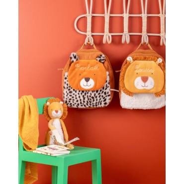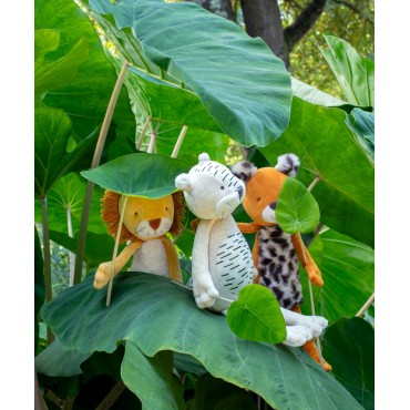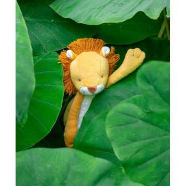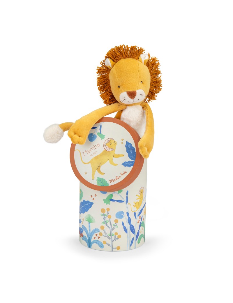Le gentil lion Mamba est tout le temps disponible pour une séance de câlins. Sa jolie crinière et sa belle fourrure blanche en font un vrai copain pour les tout-petits. Il loge dans une boîte joliment illustrée à l'aquarelle par Élodie Coudray.