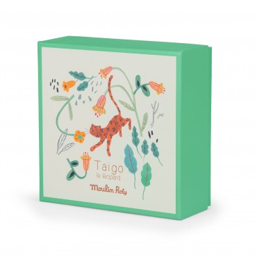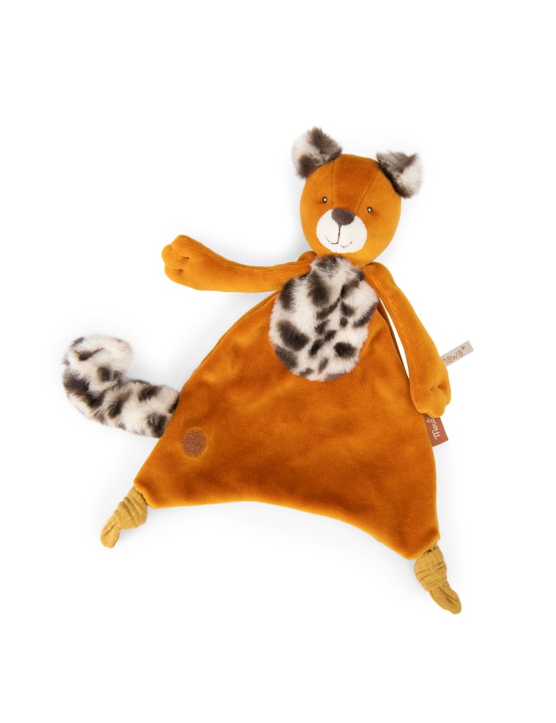 Doudou Taïgo le tigre avec sa fourrure tâchetée et ses grandes pattes. Sa queue se transforme en attache tétine à scratcher sur l'avant. Il sera le compagnon parfait pour surveiller bébé en quête de nuits paisibles. Il peut être brodé au prénom de l'enfant