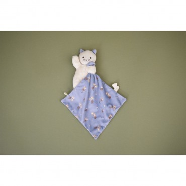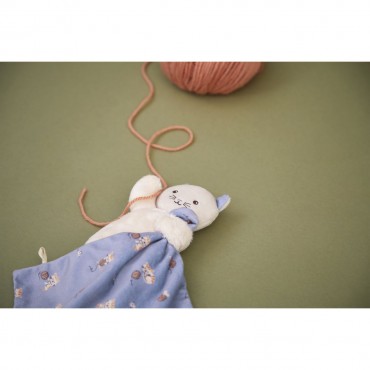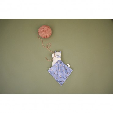 Ce chat de 14 cm enveloppé dans un carré de douceur lilas de 18 cm, sera le meilleur compagnon de bébé. Un soin particulier a été apporté dans la sélection des matériaux avec au moins 95% de matières et rembourrage recyclés. Avec son adorable corps moelleux en fourrure, le chat est facile à agripper et tenir par le corps. Le doudou carré entre ses pattes en micro-velours, est habillé d'un délicat imprimé racontant l'histoire d'un petit chat jouant avec sa pelote de laine. La couleur de cet imprimé délicat et poétique se retrouve dans les oreilles du chat et réhausse le tout. Doux comme un nuage, il sera parfait pour câliner bébé et l'étreindre chaleureusement. Présenté dans une jolie boîte cadeau, ce dernier peut être réutilisé comme étui de rangement. C'est le doudou parfait pour offrir un cadeau en matières recyclées. Lavable en machine à 30°C. Dès la naissance.