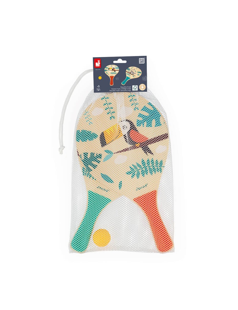 Une petite partie de raquettes au soleil, ça vous dit ? Petits et grands vont pouvoir se dépenser et s'amuser dehors avec ce jeu de raquettes en bois ! Objectif : faire le plus d'échanges sans perdre la balle des yeux. Un jeu de plein air idéal pour les enfants à partir de 5 ans, qui vont développer leur coordination et bouger dans le jardin, au parc ou au bord de la mer ! Ces 2 jolies raquettes pour enfant sont en bois issu de forêts gérées durablement (certifiées FSC®), elles ont un revêtement en plastique pour une prise en main confortable. Une verte et une orange, une team toucan et une team lémurien, aux joueurs de choisir leur camp ! Fournies avec une balle en caoutchouc, les raquettes se rangent dans leur filet en tissu pour les transporter partout ! Un jeu de plein air idéal pour s'amuser en famille ou entre copains.