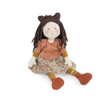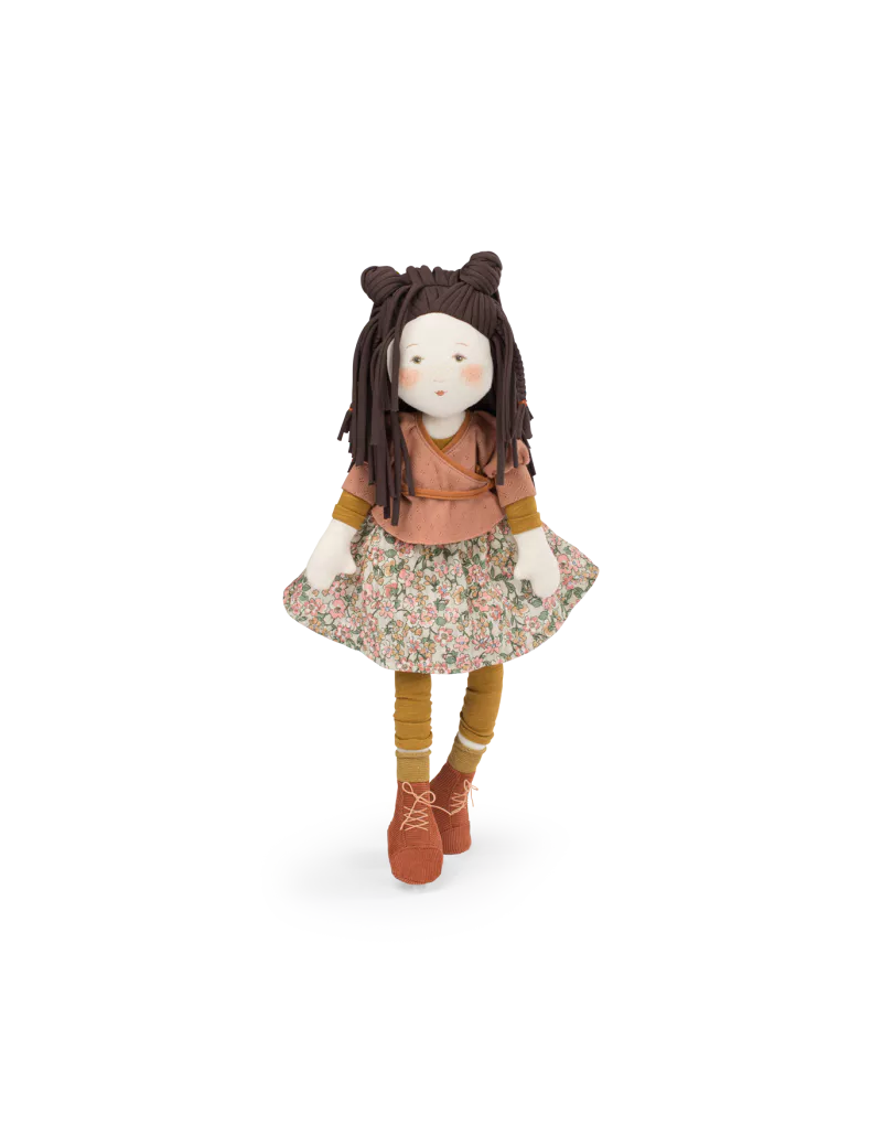 Poupée de chiffon au visage illustré et imprimé, Marjolaine porte un joli cache-cœur assorti à sa jupe fleurie et arbore une ravissante coiffure, mettant en valeur ses longs cheveux. Amie idéale, elle apporte douceur et enchantement à chaque moment de jeu