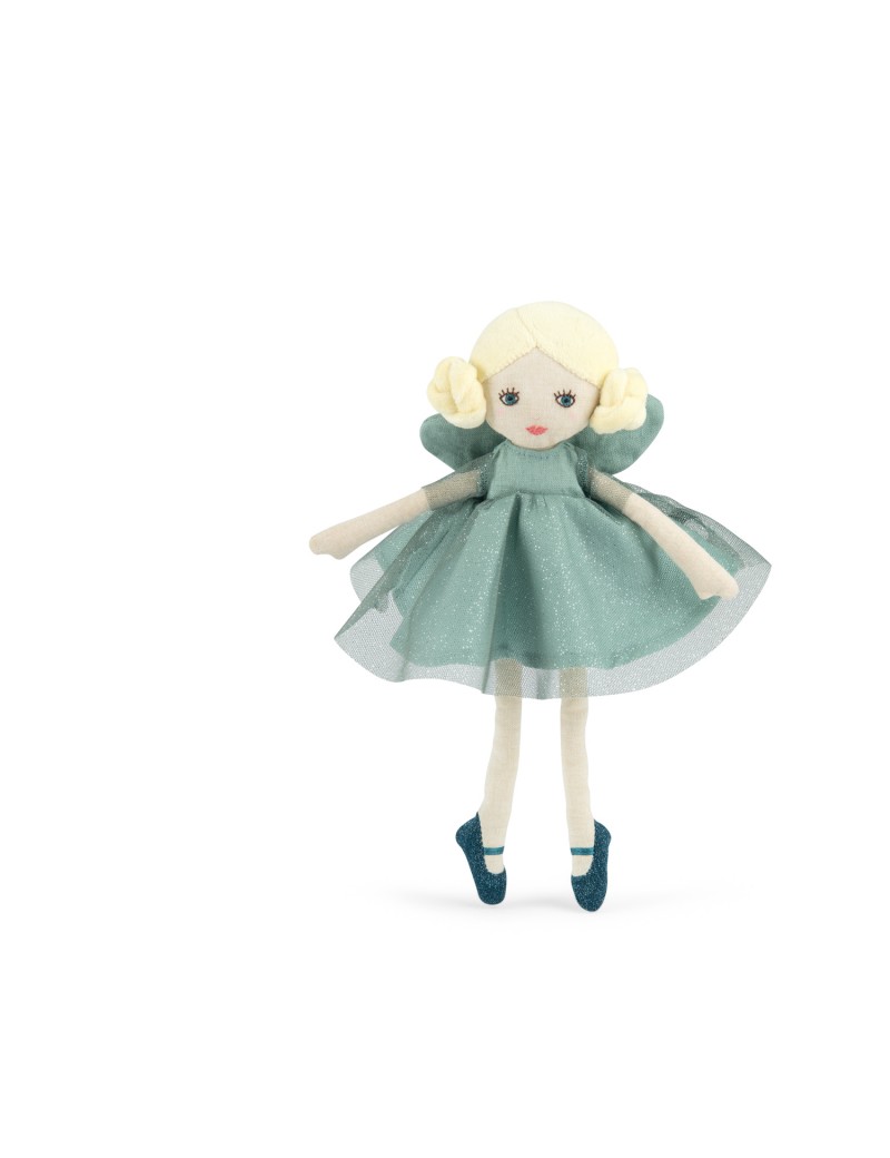 Au visage délicat brodé, coiffée de deux jolis chignons de velours décoré d'une petite étoile brillante Petite Ondine la fée est vêtue d'une robe bleue avec tulle pailleté couleur or et ailes de fée dans le dos et de petits chaussons brillants.