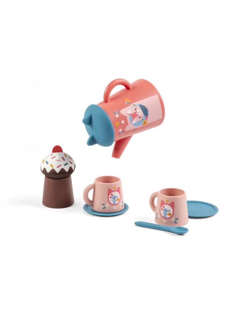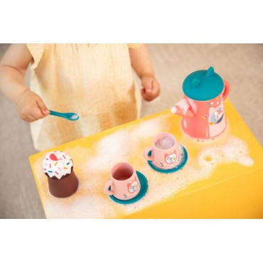 Prêts pour un goûter tout en éclaboussures ? Voilà un jouet de bain original : un set de thé, pensé pour les enfants à partir de 18 mois. Pour jouer dans l’eau comme en dehors, façon dinette, cette théière et ses accessoires sont parfaits pour imiter les grands ! Composé de 9 pièces, ce service à thé comprend : une théière à l’effigie de Jeanne le chat et son couvercle en silicone avec petites oreilles de chat, deux tasses illustrées avec des petites souris, deux sous-tasses, une petite cuillère, un muffin en deux parties pour un entretien facilité. On verse, on renverse, on transvase … Quel autre endroit convient mieux que le bain pour ça ? Vous le savez peut-être, mais notre Jeanne adore prendre le thé avec ses amies. C’est le moment pour elle de se détendre, un peu comme l’heure du bain finalement ! Ce jouet d’imitation convient aussi bien pour jouer dans l’eau que pour s’amuser en cuisine. Avec ses accessoires gourmands, il invite à la convivialité à toute heure de la journée ! Un petit goûter avec mamie ? Un gros plouf dans la baignoire ? Une séance d’arrosage pour se rafraichir lors d’une chaude journée ? Ce sont les enfants qui décident ! Pensé pour un séchage facile, il vous suffit de rincer le set à l’eau claire et de laisser sécher toutes les pièces jusqu’à la prochaine utilisation. « It’s tea time ! »