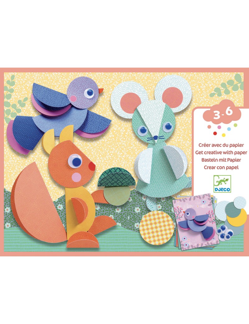 Contenu : 4 cartes illustrées, 6 feuilles de ronds papier illustrées et prédécoupées en forme de cercle, 5 yeux mobiles, 1 planche d'autocollants double face, 1 livret explicatif en couleur.