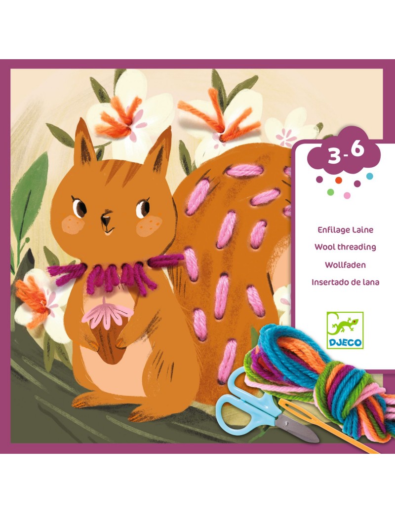 Contenu : 4 cercles en carton épais, illustrés et percés. 20 brins de 50 cm de laine. 6 couleurs. 1 aiguille. 1 paire de ciseaux. 1 livret.