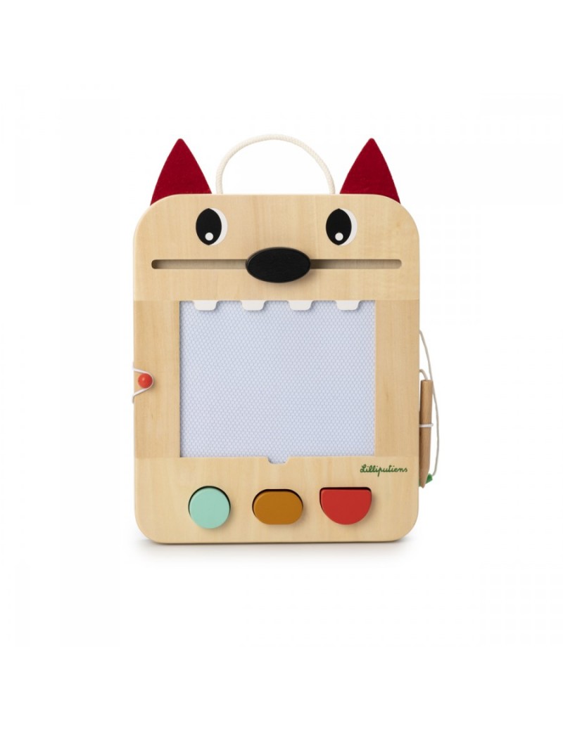 Le tableau magique de Louis le loup offre un plaisir infini de dessin et de jeu. Différentes couleurs, 3 tampons avec des formes géométriques, 6 cartes avec 12 jeux et un crayon en bois stimulent les petites mains et les esprits. Une erreur ou une envie de faire un nouveau dessin ? Alors, le museau de Louis efface le tableau. Les cartes de jeu sont rangées à l'arrière dans la fente prévue à cet effet et le crayon en bois est attaché à une corde pour ne pas le perdre.