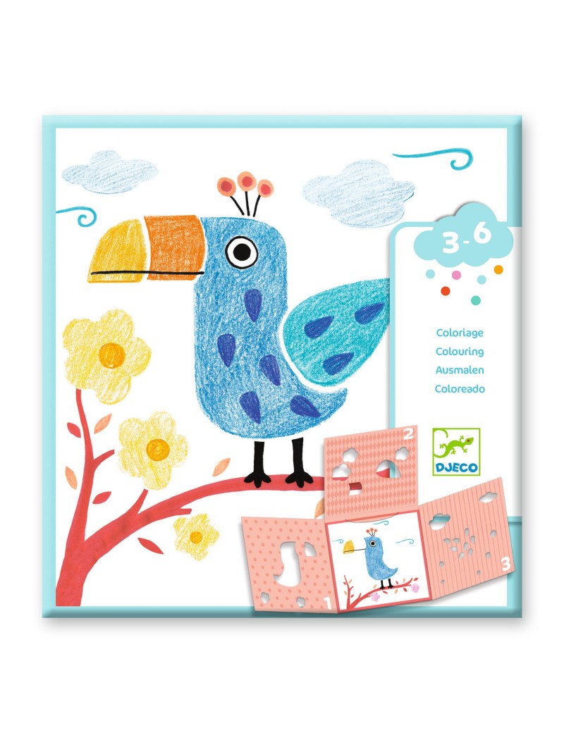 L’enfant crée son tableau à l’aide d’un seul pochoir découpé en 3. Il glisse une feuille, puis rabat le premier pochoir. Il colorie. Il ouvre et fait pareil avec le deuxième, puis le troisième. Le résultat : une magnifique œuvre d’art !