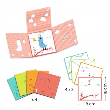 Contenu : 4 pochoirs à 3 rabats. 12 feuilles imprimées à glisser dans le pochoir.