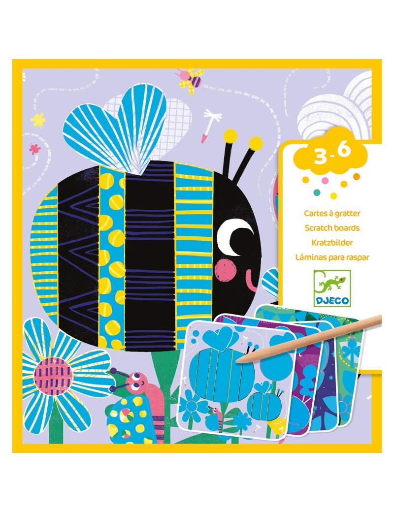 Contenu : 4 tableaux à gratter, 1 stylet en bois pointe arrondie et 1 livret explicatif pas à pas.