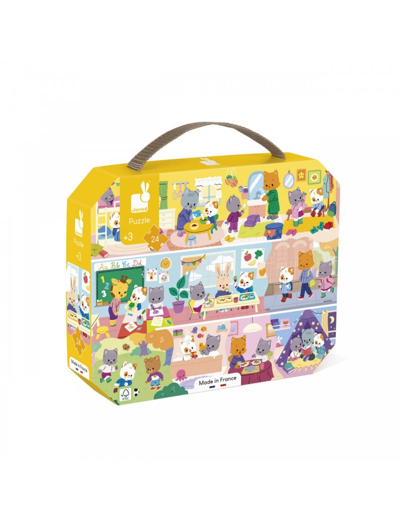 Découvrez la famille Chat et ses petits rituels du quotidien (le lever, l'école, le déjeuner etc.). Ce joli puzzle en carton sur le thème des rituels est composé de 24 pièces, 1 poster est également inclus pour aider votre enfant dans la réalisation de ce puzzle. Il est facilement transportable grâce à sa jolie valisette. Ce puzzle est idéal pour développer la patience et la motricité fine. Puzzle fabriqué en France, certifié FSCTM et à base dencre végétales. Puzzle pour les enfants à partir de 3 ans.