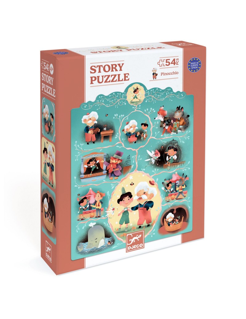 L’enfant reconstitue un puzzle pour découvrir le célèbre conte de Pinocchio sous forme d’une BD muette. Ce magnifique puzzle de 54 pièces est présenté dans une jolie boîte.