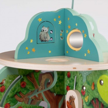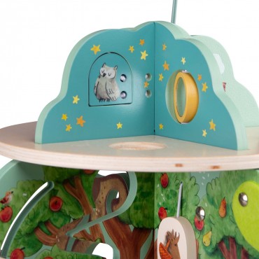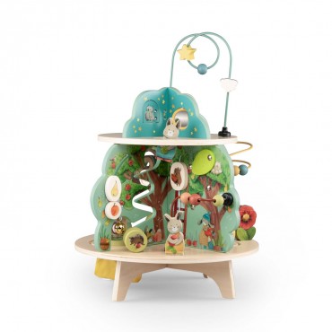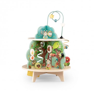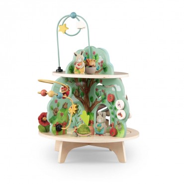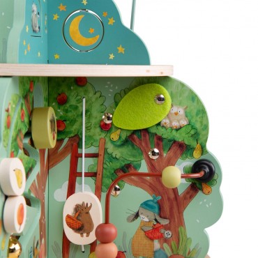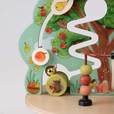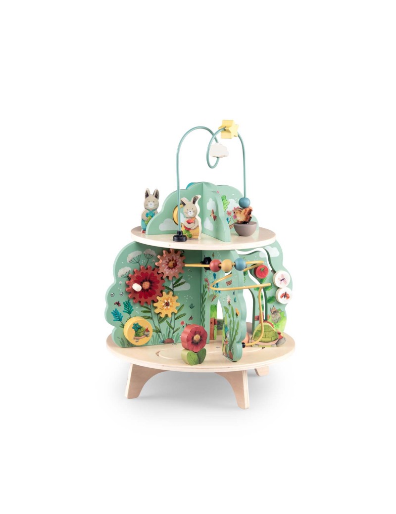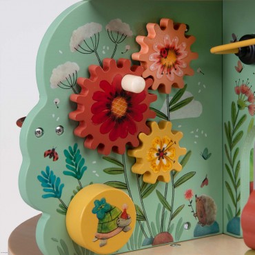 Jardin en bois multi-activités, composé de 4 univers joliment illustrés. Idéal pour l'éveil et les premiers apprentissages des tout-petits avec ses activités : grelot, engrenages, boulier, labyrinthes, miroir, feutrine pour la découverte de la texture.