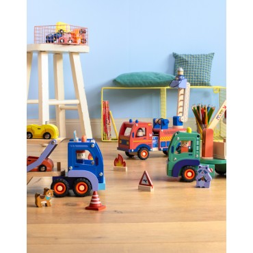 Dans l’Avenue du Moulin, les petites voitures et camions filent à toute allure. Lignes graphiques, couleurs pop et détails fluo, les jouets en bois de la collection nous transportent dans une ambiance joliment rétro, prenant vie entre les mains des petits.