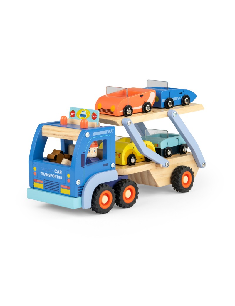 Grâce au chauffeur accompagné de son petit chien, les 4 jolies voitures arriveront à bon port à bord de ce magnifique camion en bois ! Des heures de jeu en perspective.