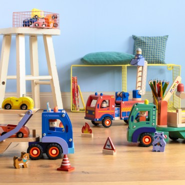 Dans l’Avenue du Moulin, les petites voitures et camions filent à toute allure. Lignes graphiques, couleurs pop et détails fluo, les jouets en bois de la collection nous transportent dans une ambiance joliment rétro, prenant vie entre les mains des petits.