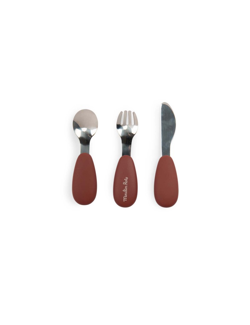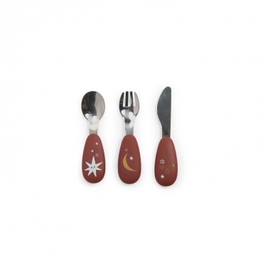 Set de 3 couverts en inox et silicone pour une bonne prise main pour manger comme les grands ! Ils sont joliment illustrés aux couleurs de la collection Après la Pluie