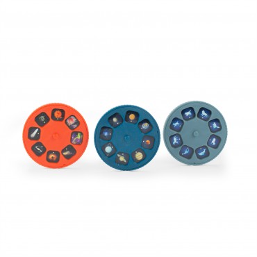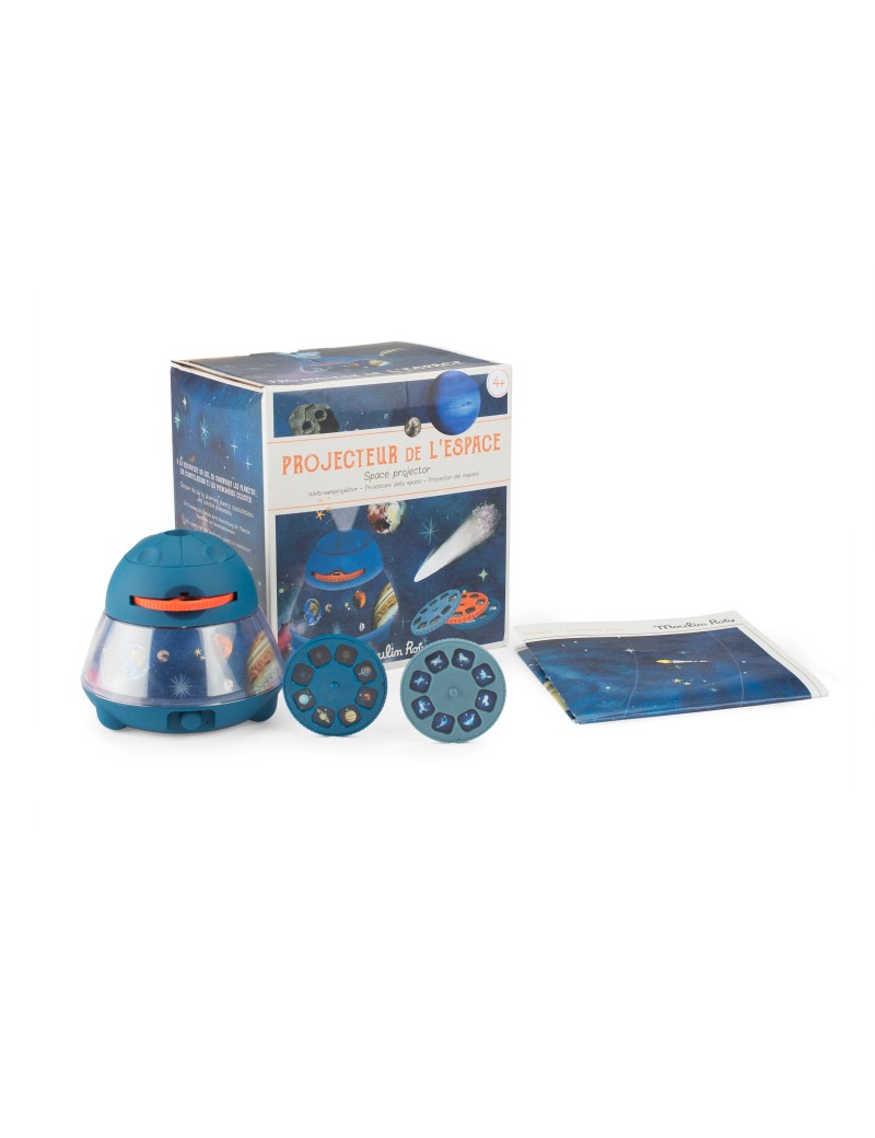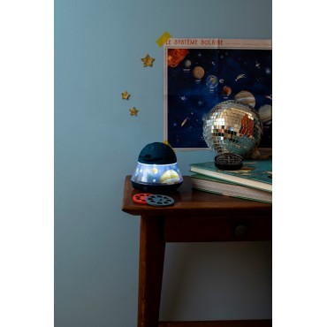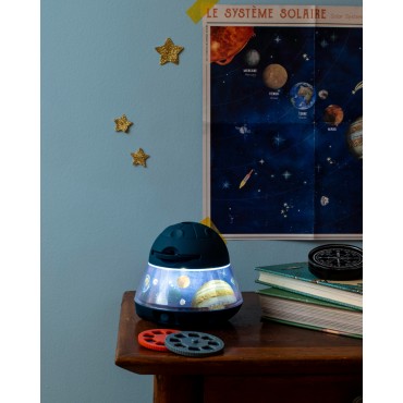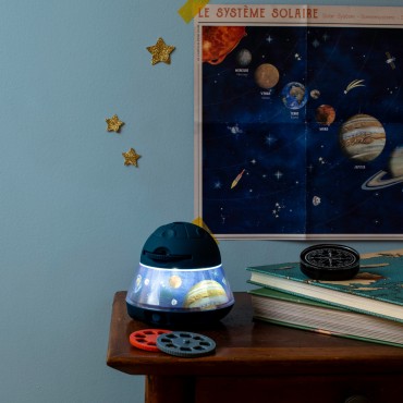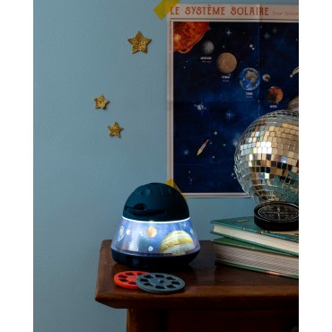 Le grand projecteur de l'espace permet de projeter planètes, constellations et comètes au mur ou au plafond. Avec ses 3 disques de 8 diapositives, l'enfant pourra découvrir le monde spatial ! Il se recharge via USB. Poster et livret d'instructions inclus.